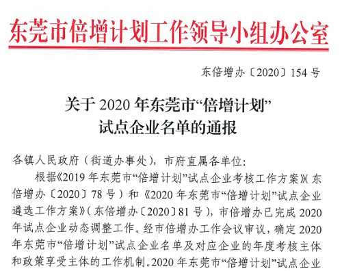 近日,東莞市倍增計劃工作領導小組辦公室發(fā)布《關于2020年東莞市“倍增計劃”試點企業(yè)名單的通報》,福日電子二級控股子公司廣東以諾通訊有限公司入選 2020年東莞市“倍增計劃”名譽試點企業(yè)名單。名譽試點企業(yè)指規(guī)模大(年營業(yè)收入達50億元及以上)、符合東莞市產(chǎn)業(yè)發(fā)展導向、對東莞市經(jīng)濟發(fā)展影響重大、帶動性強、具備較強倍增能力及意愿的企業(yè)。2020年東莞市“倍增計劃”試點企業(yè)規(guī)模涵蓋大、中、小型企業(yè),在推動東莞市產(chǎn)業(yè)可持續(xù)高質量發(fā)展方面具有良好的模范和引領作用。