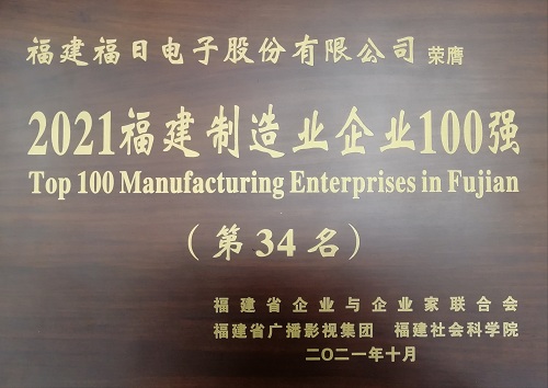 2021年11月3日,2021福建企業(yè)100強(qiáng)發(fā)布大會(huì)暨福建企業(yè)家大講壇活動(dòng)在福州舉行。會(huì)上發(fā)布了2021福建企業(yè)100強(qiáng)、制造業(yè)企業(yè)100強(qiáng)、服務(wù)業(yè)企業(yè)100強(qiáng)等榜單,福日電子入選2021福建制造業(yè)企業(yè)100強(qiáng)(第34名)。