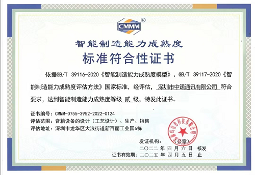 2021年9月-10月,由電子標準院授權(quán)江蘇赫瑪信息科技有限公司組建團隊,基于GB/T 39116-2020《智能制造能力成熟度模型》、GB/T 39117-2020《智能制造能力成熟度評估方法》國家標準,對中諾通訊新百麗工業(yè)園從工廠設(shè)計、產(chǎn)品研發(fā)、工藝設(shè)計、計劃與調(diào)度、生產(chǎn)作業(yè)、倉儲配送、質(zhì)量管控、設(shè)備管理、安全管控、能源管理、環(huán)保管理等20個能力子域的智能制造能力成熟度,通過人員交流、現(xiàn)場巡視、系統(tǒng)查看等方法進行評估,認定該公司智能制造能力成熟度達到貳級水平,得到國家認可。