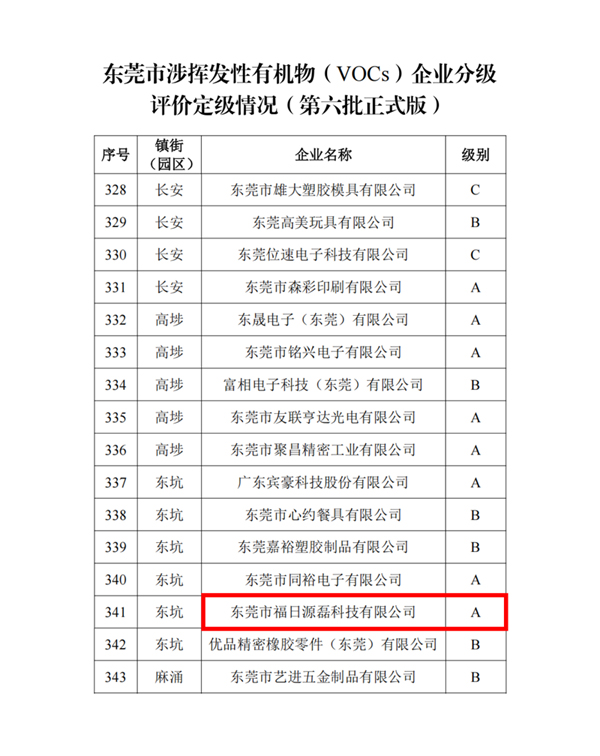 近日,東莞市生態(tài)環(huán)境局公布第六批涉揮發(fā)性有機(jī)物(VOCs)企業(yè)分級評價結(jié)果。福日電子成員企業(yè)源磊科技憑借規(guī)范完備的治理體系與持續(xù)向好的環(huán)保成效,成功獲評最高等級——A級企業(yè),環(huán)境管理能力躋身行業(yè)與區(qū)域的標(biāo)桿行列。
