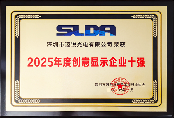 1月6日,以“未來之光·鏈接世界”為主題的深圳市照明與顯示工程行業(yè)協(xié)會(SLDA)十周年年會在深圳舉行。會上,福日電子成員企業(yè)邁銳光電憑借在創(chuàng)意顯示領(lǐng)域的持續(xù)創(chuàng)新與成熟應用,成功入選“2025年度創(chuàng)意顯示企業(yè)十強”,獲行業(yè)專家與市場客戶的高度認可。